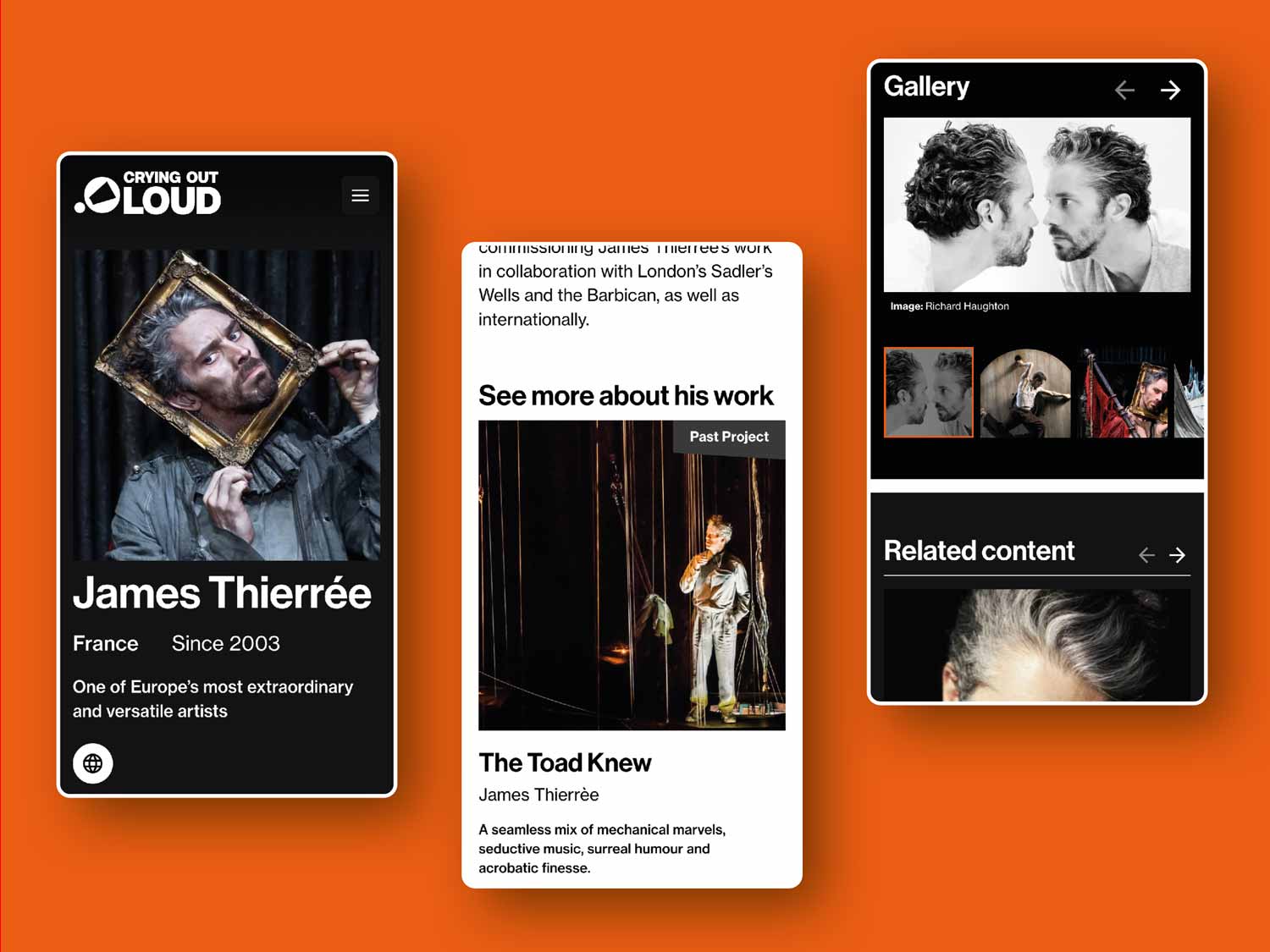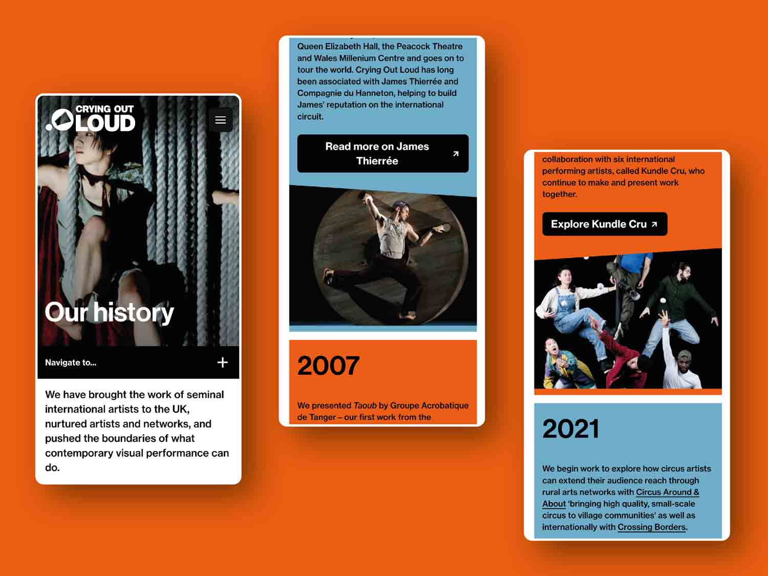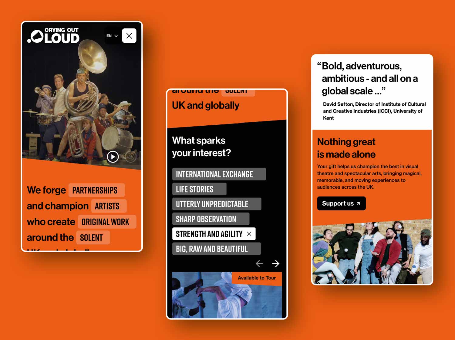 We created the branding and the first website for Crying Out Loud more than two decades ago. After their recent move to the south coast, and some fundamental changes in how they work with partners, artists and audiences, it was a treat to work with their team to rethink and redesign their site to better meet their needs.